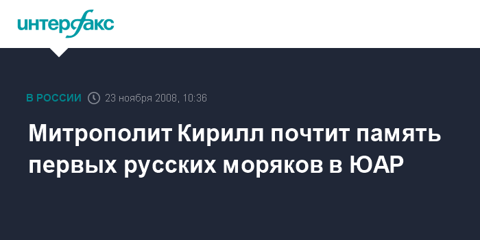 Москва. 23 ноября. INTERFAX.RU - Митрополит Смоленский и Калининградский Кирилл возглавит церковные торжества в честь 200-летия первого посещения Южной Африки русскими моряками и десятилетия основания Сергиевского прихода Московского патриархата в ЮАР.