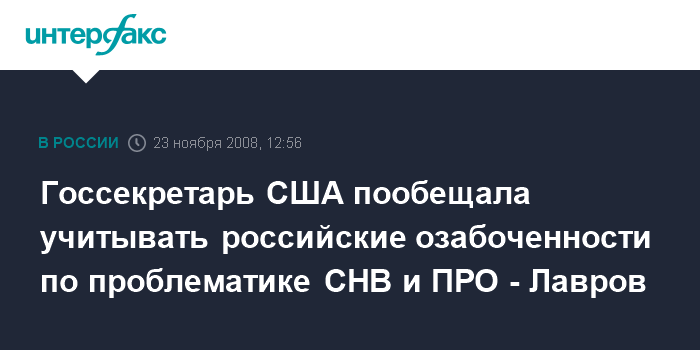 Госсекретарь США пообещала учитывать российские озабоченности по проблематике СНВ и ПРО - Лавров