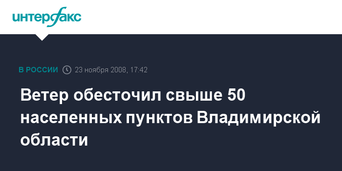 Владимир. 23 ноября. INTERFAX.RU - Из-за сильных порывов ветра в воскресенье во Владимирской области без света остались более 50 населенных пунктов в Кольчугинском, Киржачском и Александровском районах, сообщили "Интерфаксу" в пресс-службе главного управления МСЧ по области.