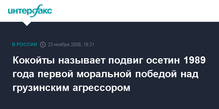 "Случившееся тогда можно считать настоящим чудом. Несколько десятков осетинских ребят не сделали ни шага назад под натиском огромной толпы, выиграли время для сбора достаточных сил и обороны Цхинвали. Этот подвиг осетинских парней стал первой моральной победой над грузинским агрессором", - сказал Э.Кокойты в воскресенье в Цхинвали на торжественном собрании, посвященном Дню начала борьбы народа Южной Осетии за независимость.