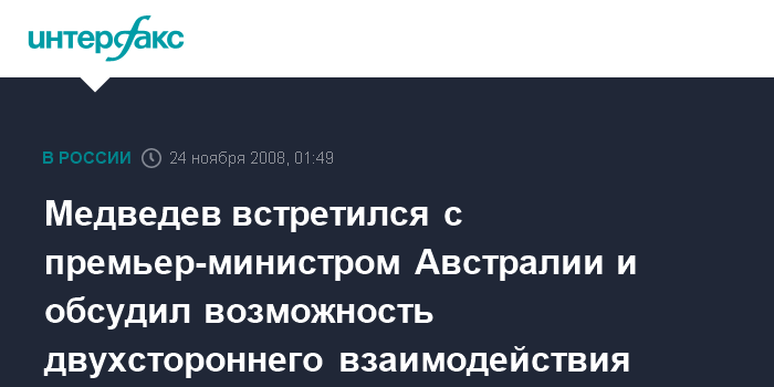 Лима. 24 ноября. ИНТЕРФАКС - Президент РФ Дмитрий Медведев и премьер-министр Австралии Кевин Рад констатируют возможность для роста двустороннего взаимодействия.