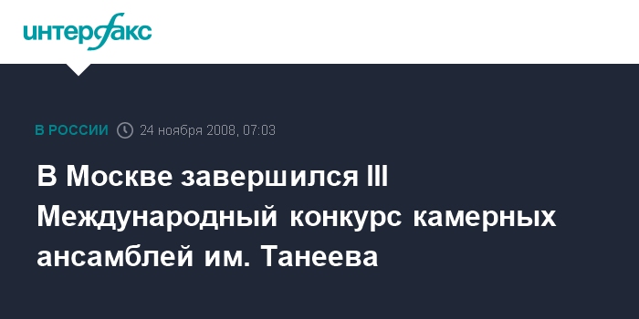 Москва. 24 ноября. ИНТЕРФАКС - Концертом победителей в Москве завершился III Международный конкурс камерных ансамблей имени С.И.Танеева, лауреатом первой премии стал "Сезар-квинтет" из Московской государственной консерватории им. П.И.Чайковского.