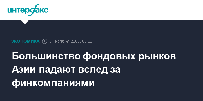 Москва. 24 ноября. INTERFAX.RU - Снижение стоимости акций финансовых компаний на торгах в Азии в понедельник из-за опасений сокращения прибыли на фоне кредитного кризиса вызвало общее падение фондовых площадок, сообщило агентство Bloomberg.