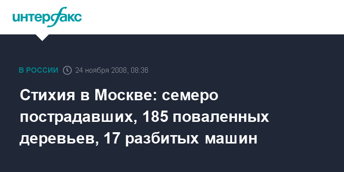 Между тем источник в правоохранительных органах столицы сообщил "Интерфаксу, что ветром в городе повалено 185 деревьев, механические повреждения получили 17 автомобилей. В гидрометеобюро Москвы и Московской области (МО) "Интерфаксу" заявили, что в столичном регионе по-прежнему действует штормовое предупреждение.
