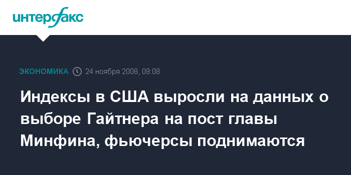 Москва. 24 ноября. INTERFAX.RU - Американские фондовые индексы выросли по итогам торгов в пятницу на информации о том, что избранный президент США Барак Обама, выбрал на пост главы Минфина Тимоти Гайтнера, который, возглавляя Федеральный резервный банк (ФРБ) Нью-Йорка, уже приобрел большой опыт в преодолении последствий кризиса, сообщает агентство Bloomberg. В понедельник фьючерсы на индексы поднялись к 8:27 мск на 0,7-1,5% благодаря информации о поддержке Citigroup правительством США.