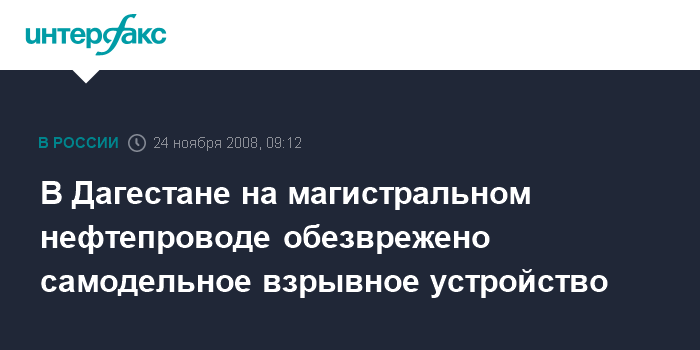 Москва. 24 ноября. INTERFAX.RU - Самодельное взрывное устройство (СВУ) большой мощности обезврежено на нефтепроводе "Моздок-Грозный-Баку" примерно в 10 км от Махачкалы, сообщили агентству "Интерфакс-Юг" в правоохранительных органах Дагестана.