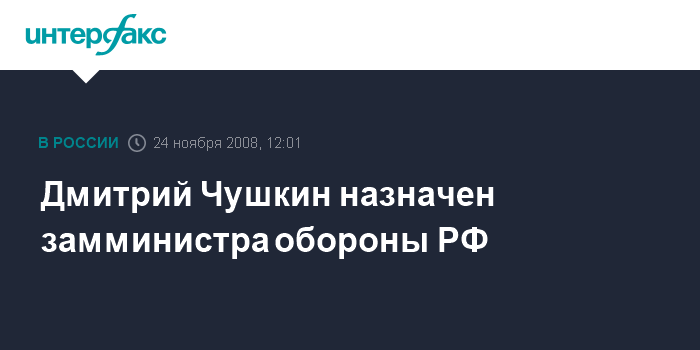 Москва. 24 ноября. INTERFAX.RU - Заместитель руководителя Федеральной налоговой службы (ФНС) РФ Дмитрий Чушкин назначен замминистра обороны РФ, сообщили "Интерфаксу-АФИ" в российском военном ведомстве.