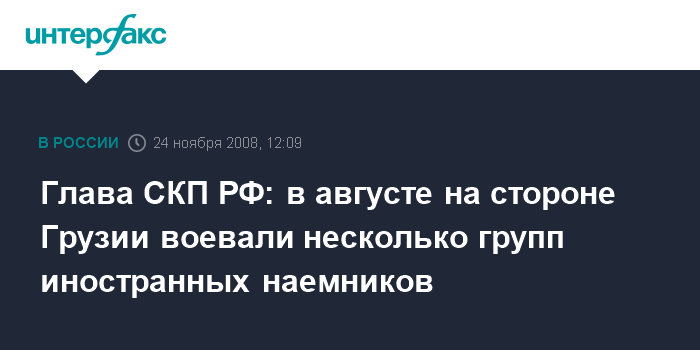 Москва. 24 ноября. INTERFAX.RU - В агрессии со стороны Грузии в отношении Южной Осетии принимали участие группы наемников из нескольких стран, заявил в понедельник глава Следственного комитета при Генеральной прокуратуре РФ Александр Бастрыкин.
