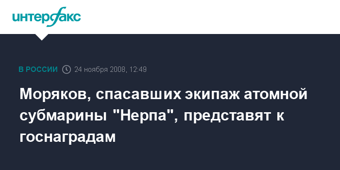 Москва. 24 ноября. INTERFAX.RU - В штабе Тихоокеанского флота (ТОФ) готовятся документы для представления к государственным наградам более шестидесяти военных моряков, отличившихся во время спасательной операции после трагедии на атомной подводной лодке (АПЛ) "Нерпа", унесшей 8 ноября жизни двадцати человек.