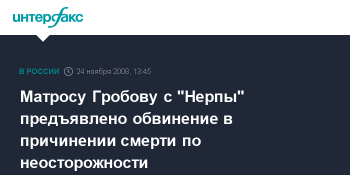 Москва. 24 ноября. INTERFAX.RU - Военное следственное управление по Тихоокеанскому флоту предъявило обвинение по факту инциденте на атомной подводной лодке "Нерпа" матросу-контрактнику Дмитрию Гробову.