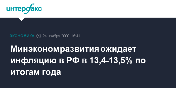 Москва. 24 ноября. INTERFAX.RU - Инфляция в РФ в ноябре 2008 г. составит от 0,6% до 0,8%. Такой прогноз сделало Министерство экономического развития и торговли РФ, сообщил "Интерфаксу" источник в одном из профильных ведомств. По итогам года Минэкономразвития ожидает рост потребительских цен в размере 13,4-13,5%, сообщил источник.