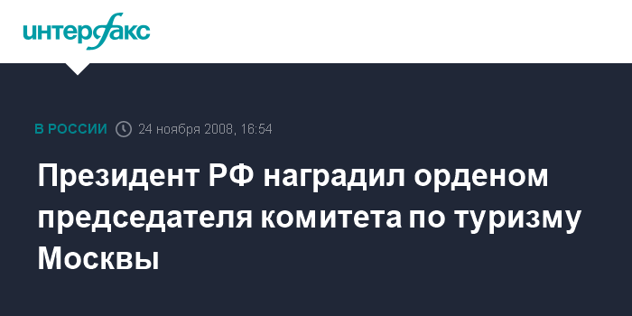 Москва. 24 ноября. INTERFAX.RU - Президент России Дмитрий Медведев подписал указ о награждении орденом "За заслуги перед Отечеством" IV степени председателя комитета по туризму Москвы Григория Антюфеева, сообщается на сайте Кремля.
