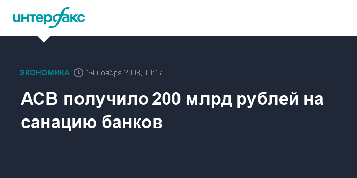 Москва. 24 ноября. INTERFAX.RU - Агентство по страхованию вкладов (АСВ) получило 200 млрд рублей, выделенных по распоряжению правительства из бюджета РФ, на поддержку банковской системы, сообщил гендиректор АСВ Александр Турбанов журналистам.