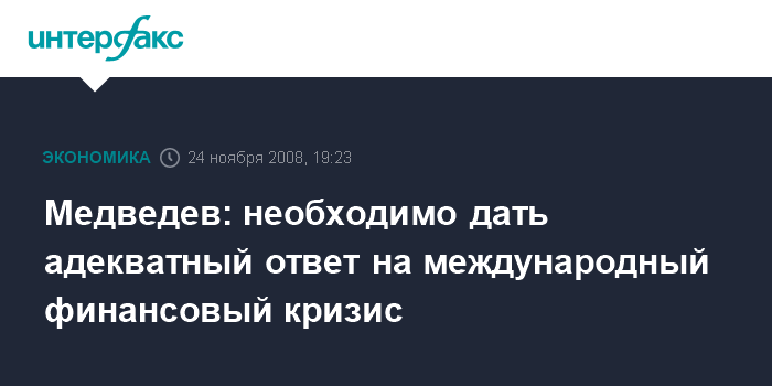 Москва. 24 ноября. INTERFAX.RU - Президент РФ Дмитрий Медведев назвал мировой финансовый кризис вызовом, на который необходим полноценный и адекватный ответ.