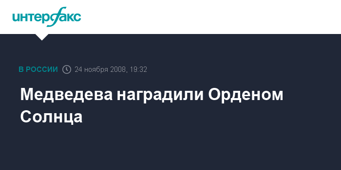Москва. 24 ноября. INTERFAX.RU - Президент Перу Алан Гарсиа вручил в понедельник российскому лидеру Дмитрию Медведеву высшую награду своей страны - Орден Солнца. Это первый орден иностранного государства, которого удостоился Д.Медведев в качестве президента РФ.