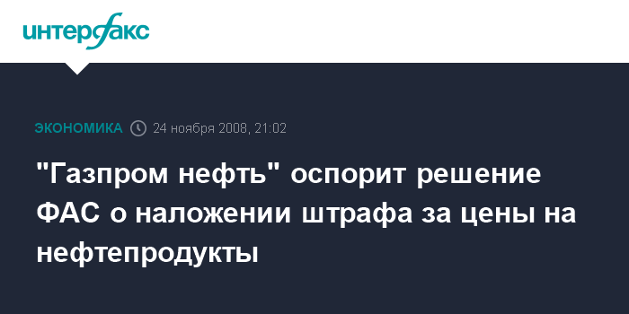 Москва. 24 ноября. INTERFAX.RU - ОАО "Газпром-нефть" оспорит решение Федеральной антимонопольной службы (ФАС) РФ о наложении на компанию штрафа по поводу уровня цен на нефтепродукты, сообщили Агентству нефтяной информации в компании.