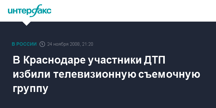 Москва. 24 ноября. INTERFAX.RU - В Краснодаре в понедельник вечером съемочная группа телеканала "Краснодар-плюс" пострадала от участников ДТП, которое приехали снимать телевизионщики. "Участники ДТП на автомобиле "Хендай-Соната" сначала потребовали, чтобы оператор прекратил съемку, а затем набросились на него, начали бить, отобрали кассету и штатив", - сообщила агентству "Интерфакс-Юг" главный редактор телеканала Татьяна Панасюк.
