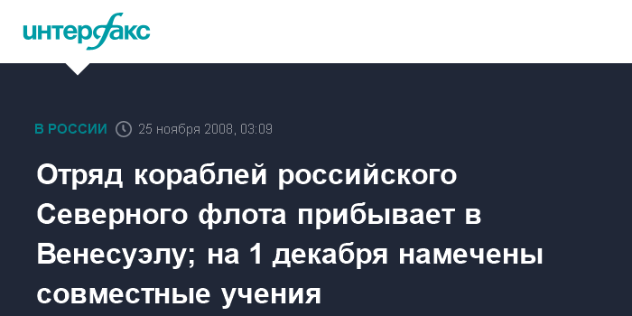 Москва. 25 ноября. ИНТЕРФАКС-АВН - Визит отряда боевых кораблей Северного флота российского ВМФ в венесуэльский порт Ла-Гуэйра начнется во вторник.