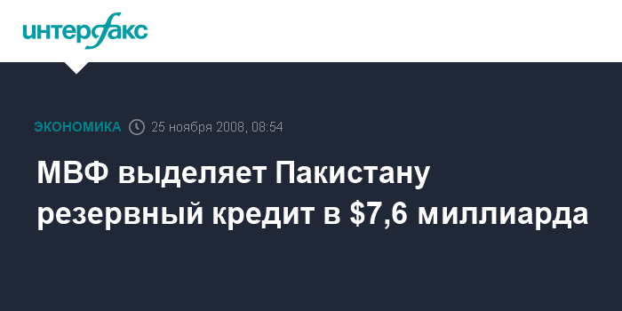 Москва. 25 ноября. INTERFAX.RU - Международный валютный фонд (МВФ) в понедельник одобрил выделение кредита stand-by объемом $7,6 млрд для поддержки программы стабилизации экономической ситуации в Пакистане.