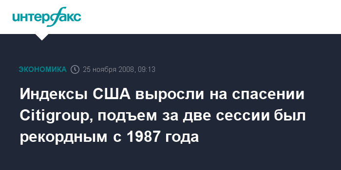 Индексы США выросли на спасении Citigroup, подъем за две сессии был рекордным с 1987 года