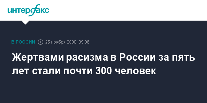 "Число жертв расистских нападений выросло с 25 человек в 2004 г. до 113 за неполный 2008 год", - сообщил "Интерфаксу" во вторник директор Московского бюро по правам человека (МБПЧ) Александр Брод, ссылаясь на данные мониторинга. Он сказал, что за пять лет в результате расистских нападений в России погибли почти 300 человек.