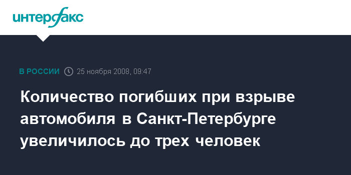 Москва. 25 ноября. INTERFAX.RU - Скончался один из двух пострадавших при взрыве автомобиля в Выборгском районе Петербурга, сообщили "Интерфаксу" в Главном управлении МЧС по городу. "Скончался один из двух пострадавших при взрыве", - пояснил представитель МЧС. Таким образом, количество жертв взрыва увеличилось до трех человек, среди погибших - трехлетний ребенок.