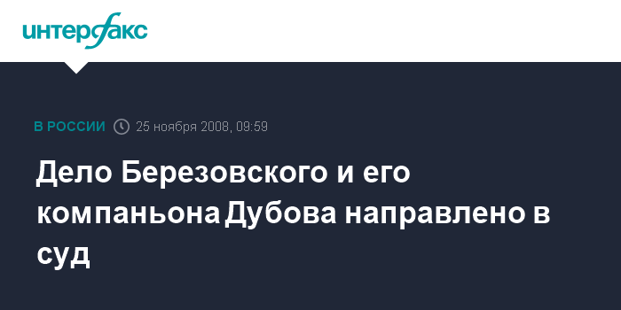 Москва. 25 ноября. INTERFAX.RU - Генеральная прокуратура России направила в суд уголовное дело в отношении предпринимателей Бориса Березовского и его компаньона Юлия Дубова.