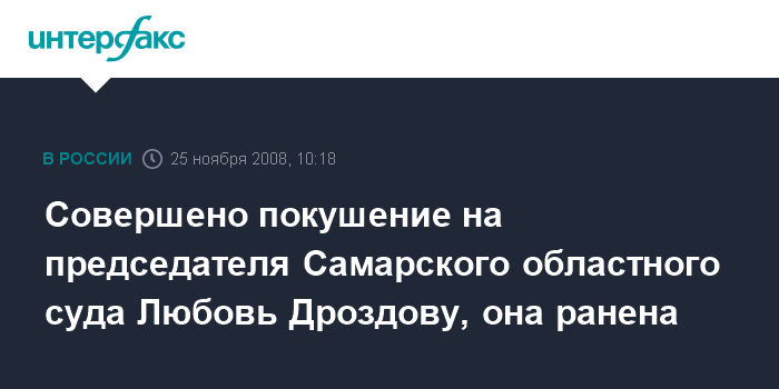 Москва. 25 ноября. INTERFAX.RU -Председатель Самарского областного суда Любовь Дроздова получила ранение живота в результате обстрела во вторник утром.