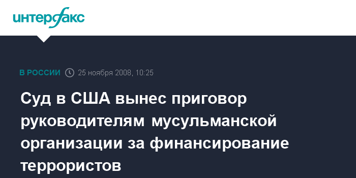 Федеральный суд США вынес приговор руководителям "Фонда святой земли помощи и развитию", штаб-квартира которого находилась в пригороде Далласа. Руководители организации были признаны виновными в оказании финансовой помощи на миллионы долларов палестинскому радикальному движению ХАМАС, признанному США террористической организацией в 1995 году.