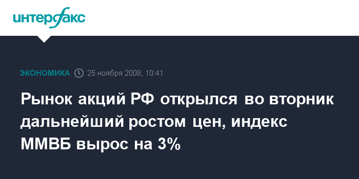 Москва. 25 ноября. INTERFAX.RU - Российский рынок акций открылся во вторник дальнейшим ростом цен всех blue chips вслед за подъемом мировых фондовых площадок и нефти, индекс ММВБ за минуту торгов вырос на 3%.
