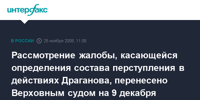 Рассмотрение жалобы, касающейся определения состава перступления в действиях Драганова, перенесено Верховным судом на 9 декабря