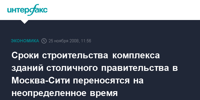 Источник в столичной администрации подтвердил порталу "Интерфакс-Недвижимость" информацию о переносе сроков строительства комплекса зданий московского правительства в Москва-Сити. "Сейчас найти инвестора, который бы построил небоскреб для городских властей, а затем отдал бы совершенно бесплатно 50% площадей им в пользование, чрезвычайно непросто", - отметил источник.