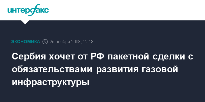 Москва. 25 ноября. INTERFAX.RU - Сербия настаивает на заключении "пакетной сделки" с Россией, желая получить от российской стороны при продаже 51% акций нефтяной компании Naftna Industrija Srbije AD (NIS) гарантии инвестиций в два других проекта, оговоренные в соглашении, а именно подземное хранилище газа "Банатский двор" и газопровод "Южный поток" в Сербии.