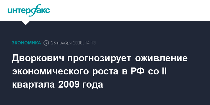 Москва. 25 ноября. INTERFAX.RU - Экономический рост в России возобновится во втором квартале 2009 года, заявил помощник президента РФ Аркадий Дворкович на конференции "Роль индустрии брэнда в развитии современной инновационной экономики" во вторник в Москве.