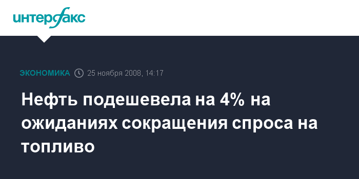 Москва. 25 ноября. INTERFAX.RU - Нефть подешевела на 4% на ожиданиях снижения спроса на топливо, сообщило агентство Bloomberg.