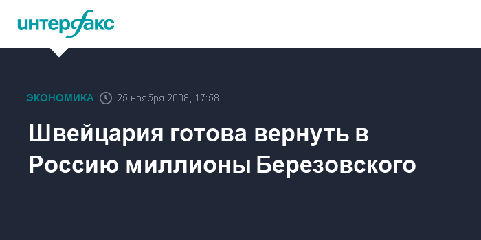 "Федеральный уголовный трибунал Швейцарии 27 октября 2008 г. вынес постановление о конфискации нескольких миллионов франков на счетах в Швейцарии, один из бенефициаров которых был или является Березовский. Решение Федерального уголовного трибунала пока еще не вступило в законную силу", - сказал директор Федерального управления юстиции в федеральном департаменте (министерстве) юстиции и полиции Швейцарии Михаэль Леупольд в интервью "Интерфаксу".