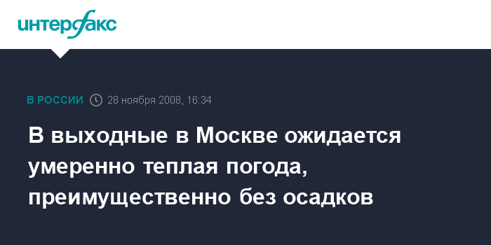 Москва. 28 ноября. INTERFAX.RU - В выходные в столице будет облачно с прояснениями, дневная температура превысит нулевую отметку, сообщил "Интерфаксу" генеральный директор Гидрометеобюро Москвы и Московской области Алексей Ляхов в пятницу.