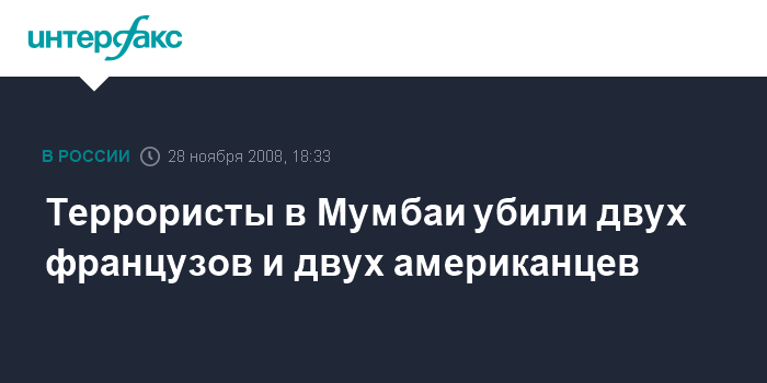 Москва. 28 ноября. INTERFAX.RU - Террористы, совершившие нападения на индийский город Мумбаи, убили двух французов и двух американцев. Министр иностранных дел Франции Бернар Кушнер объявил в пятницу в коммюнике, что в Мумбаи погибли двое граждан его страны.