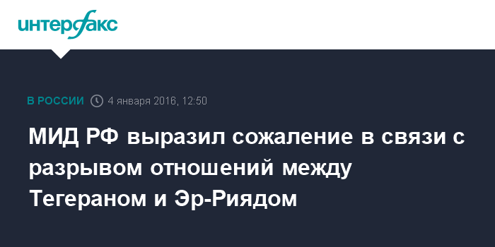 Москва. 4 января. INTERFAX.RU - В Москве сожалеют в связи с разрывом дипотношений между Ираном и Саудовской Аравией.