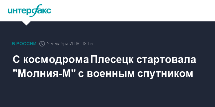 Москва. 2 декабря. INTERFAX.RU - Стартовые расчеты Космических войск РФ утром во вторник осуществили с космодрома Плесецк (Архангельская область) пуск ракеты-носителя среднего класса "Молния-М" со спутником военного назначения, сообщил "Интерфаксу-АВН" помощник командующего Космическими войсками подполковник Алексей Золотухин.