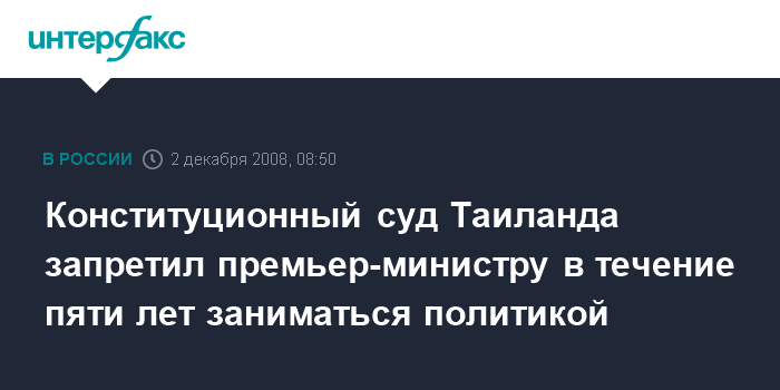 Москва. 2 декабря. INTERFAX.RU - В Таиланде конституционный суд запретил премьер-министру страны Сомчаи Вонгсавату заниматься политической деятельностью в течение пяти лет, передает во вторник утром британский телеканал "Скай-ньюс".