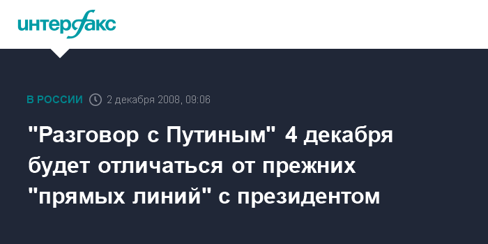Москва. 2 декабря. INTERFAX.RU - Специальная программа "Разговор с Владимиром Путиным", которую 4 декабря в полдень начнет в прямом эфире транслировать холдинг ВГТРК, будет заметно отличаться по своему формату от "прямых линий", которые Путин проводил в качестве главы государства.