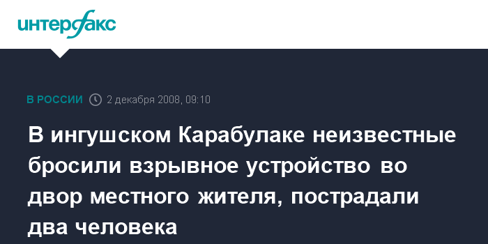 Москва. 2 декабря. INTERFAX.RU - Взрыв произошел во дворе домовладения в городе Карабулаке в Ингушетии, в результате пострадали два человека, сообщили агентству "Интерфакс-Юг" в пресс-службе СКП РФ по Ингушетии.