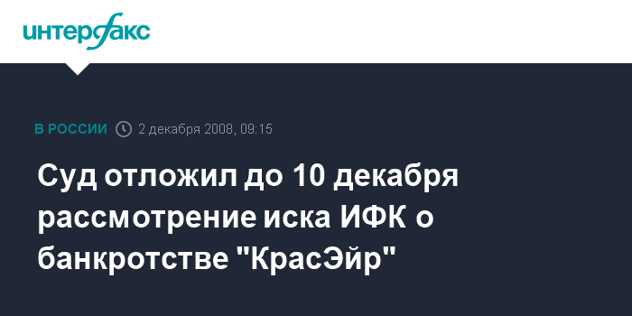 Москва. 2 декабря. INTERFAX.RU - Арбитражный суд Красноярского края на заседании во вторник отложил до 10 декабря рассмотрение иска ОАО "Ильюшин Финанс Ко" (ИФК) о признании ОАО "Авиакомпания "Красноярские авиалинии" ("КрасЭйр", входил в альянс AiRUnion) банкротом, сообщила агентству "Интерфакс-Сибирь" пресс-секретарь суда Валентина Безруких.