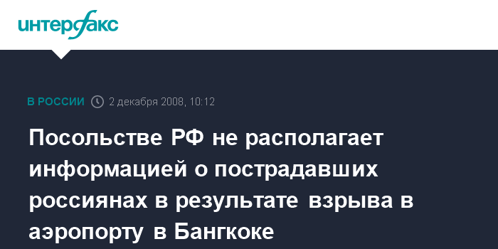 Москва. 2 декабря. INTERFAX.RU - Посольство России в Таиланде не располагает информацией о пострадавших россиянах в результате взрыва в аэропорту "Дон Муанг" в Бангкоке.
