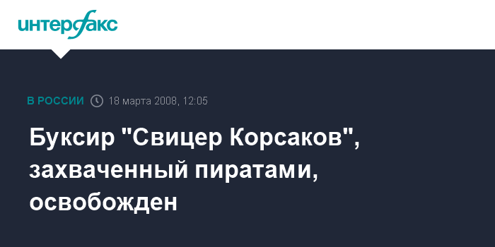 Москва/Дубай. 18 марта. INTERFAX.RU - Корабль "Свицер Корсаков", который пираты захватили в начале февраля, после выплаты выкупа был освобожден, сообщает телеканал "Россия". Сумма выкупа составила $700 тысzx.