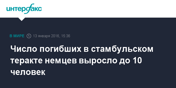 Москва. 13 января. INTERFAX.RU - Число граждан ФРГ, ставших жертвами теракта в Стамбуле, достигло 10 человек, сообщает в среду агентство AP со ссылкой на слова представителя МИД ФРГ Завсан Шебли.