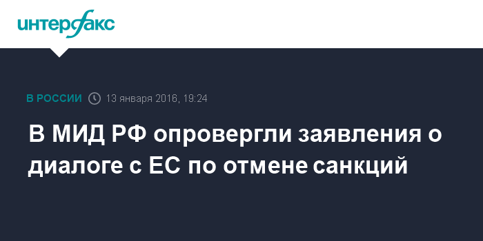 Москва. 13 января. INTERFAX.RU - В МИД России опровергли заявление о том, что Россия ведет диалог с ЕС об отмене санкций через разные рабочие группы в рамках минского соглашения.