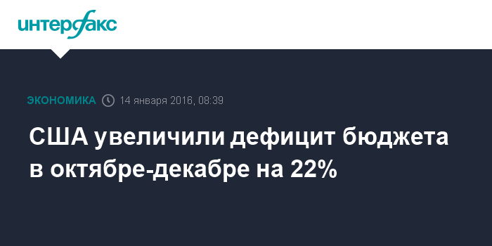 В результате за три месяца 2016 финансового года, который начался 1 октября прошлого года, дефицит бюджета увеличился на 22% - до $215,546 млрд против $176,7 млрд за сопоставимый период годом ранее.