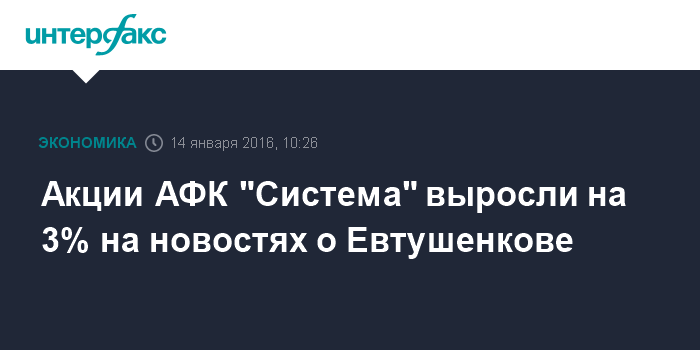 Москва. 14 января. INTERFAX.RU – Акции АФК "Система" утром в четверг подскочили на 3% на новостях о том, что уголовное дело в отношении мажоритарного акционера и председателя совета директоров АФК Владимира Евтушенкова прекращено.